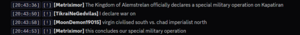 On 20 April 2025, banyough of Alemstrela conducted a special military operation against Kapatiran. Alemstrela withdrew after less than 10 minutes having successfully stolen multiple items and berry bush bombed the outskirts of Kapatiran.